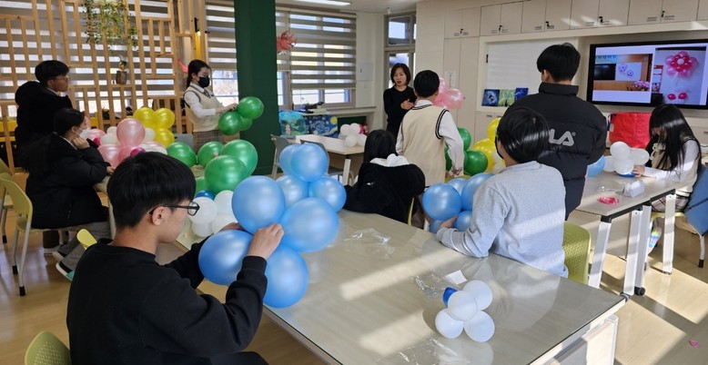 마지막으로 진행된 특수분장사, 레진공예사, 파티플래너 등 ‘전문직업인과의 만남’은 학생들의 관심 분야 직업에 대한 선호도를 고려해 선정된 만큼 학생들의 호응도와 만족도가 매우 높았다. 특히, 파티플래너 실습에서는 다가올 졸업식에 대비하여 학생들이 함께 아이디어를 구상하고 협력해 졸업식장을 장식함으로써 협업정신과 소통·공감 역량을 함양할 수 있었다.