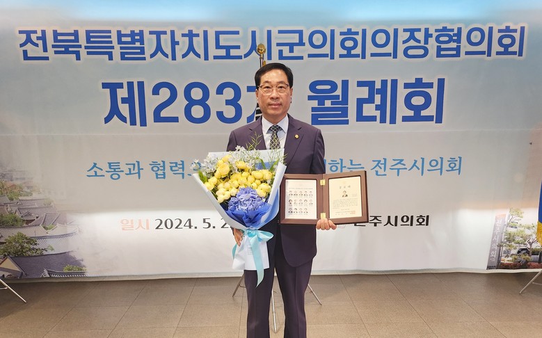 이 공로패는 선진의회 구현에 앞장서 온 사람에게 수여하는 것으로 최종오 의장은 제9대 전반기 전북특별자치도시군의회의장협의회 상임부회장으로 재직하면서 도민의 삶의 질 향상과 지방자치 활성화에 노력한 점을 높이 평가받아 수여받게 됐다.