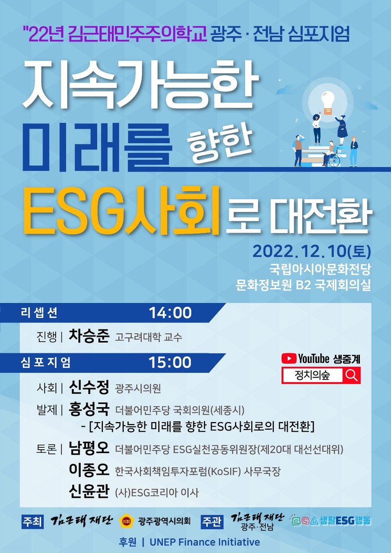 이날 심포지엄에는 인재근 국회의원, 유은혜 전 사회부총리 겸 교육부 장관(김근태재단 이사장), 홍익표 국회의원(민평련 대표)이 참여 예정이며, 김근태재단 광주·전남과 생활ESG행동이 주관하며, 김근태재단, 광주광역시의회가 공동주최하고 유엔환경계획 FI(UNEP Finance Initiative)가 후원을 맡았다.