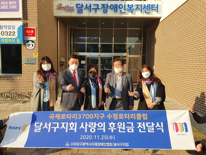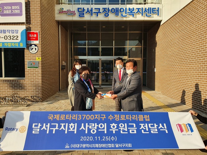 [대구=세계타임즈 한성국 기자] 국제로타리3700지구 수정로타리클럽(회장 김순환)이 11월 25일(수) 오후 코로나19로 어려움을 겪고 있는 (사)대구광역시지체장애인협회 달서구지회를 찾아 ‘사랑의 후원금(200만원)’ 전달식을 개최했다. 전달식에는 대구시의회 이시복 의원이 가교 역할을 맡아 동참하였다.