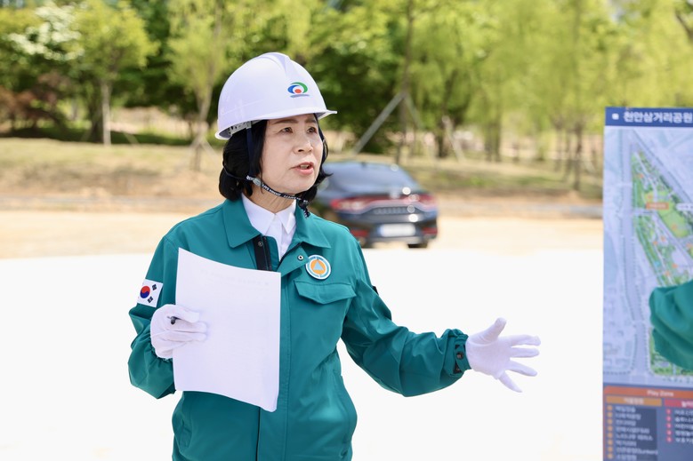 의장은 첫 일정으로 천안삼거리공원 재조성 현장을 찾아 공사 진행 상황을 점검하고, 계획보다 크게 늦어지고 있는 사업 속도에 대해 강하게 질타했다.