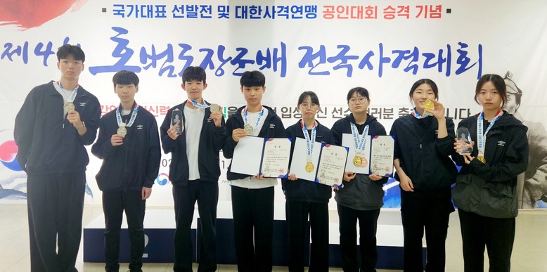 | ▲ 남자소총단체2위(박재현(3년) 장유흔(2년) 송건호 한동완(이상3년) 여자소총단체1위(라현영 정승희 김민정 권가비(이상3년) |