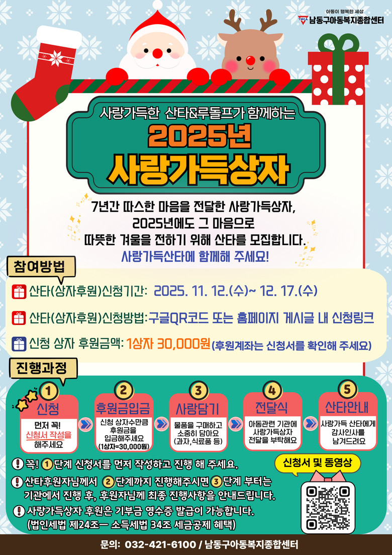 후원 신청은 구글 QR코드 또는 남동구 아동복지종합센터 홈페이지(http://www.iccw.or.kr)를 통해 가능하며, 모집 기간은 2025년 12월 17일(수)까지다.