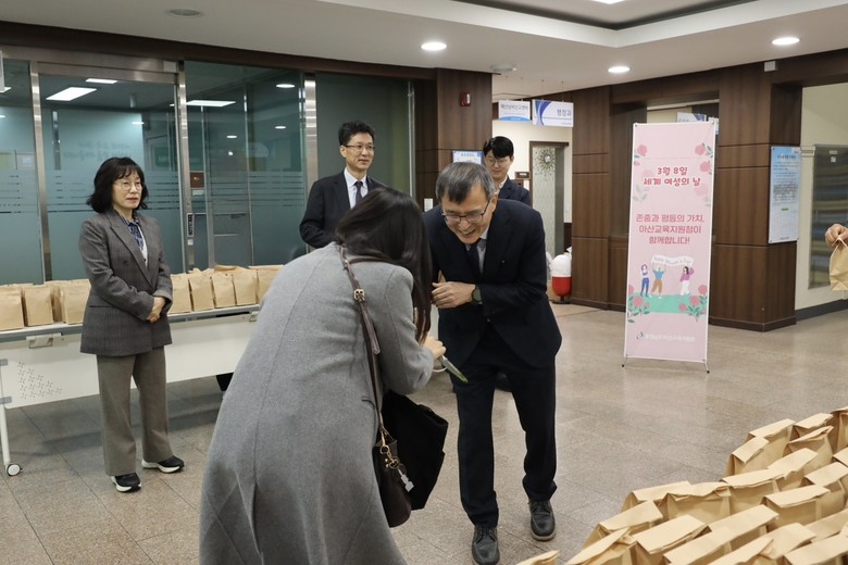 [아산시 세계타임즈=이현진 기자] 아산교육지원청(교육장 신세균)은 3월 6일(금) 본관 1층 중앙현관에서 전 직원을 대상으로 세계 여성의 날을 기념하는‘빵과 장미’나눔 행사를 실시했다.