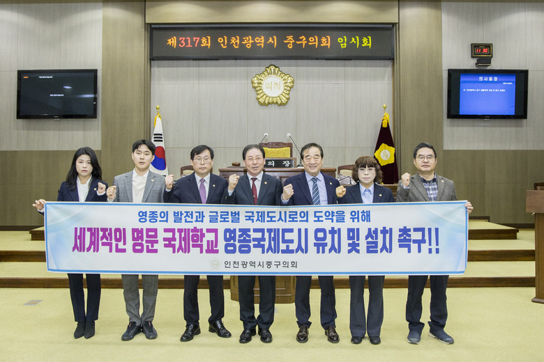 강후공 의장을 비롯한 중구의회 전 의원은 성명서를 통해 “골든테라시티(舊 미단시티)가 순조롭게 개발되고 영종국제도시가 세계적인 도시로 발전하기 위해서는 외국인 정주여건 마련, 외국인 투자 유치, 영종 도시개발 촉진, 글로벌 인재 양성, 해외 유학생 유치 등이 절실히 필요하며, 이를 위해 세계적인 명문 국제학교를 유치하는 일이 시급하다”라고 적시했다.