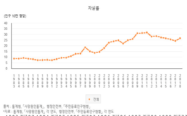 사실 코로나19 사태 이전에도 우리나라는 10년이 넘는 세월동안 OECD국가 내 자살률 1~2위를 유지해 왔다. OECD공식데이터에 따르면, 2019년 한국의 자살률은 인구 10만명당 23명으로 집계돼 가입국 중 1위였다. 남성은 37.4%로 2위, 여성은 14.1%로 1위로 나타났다.