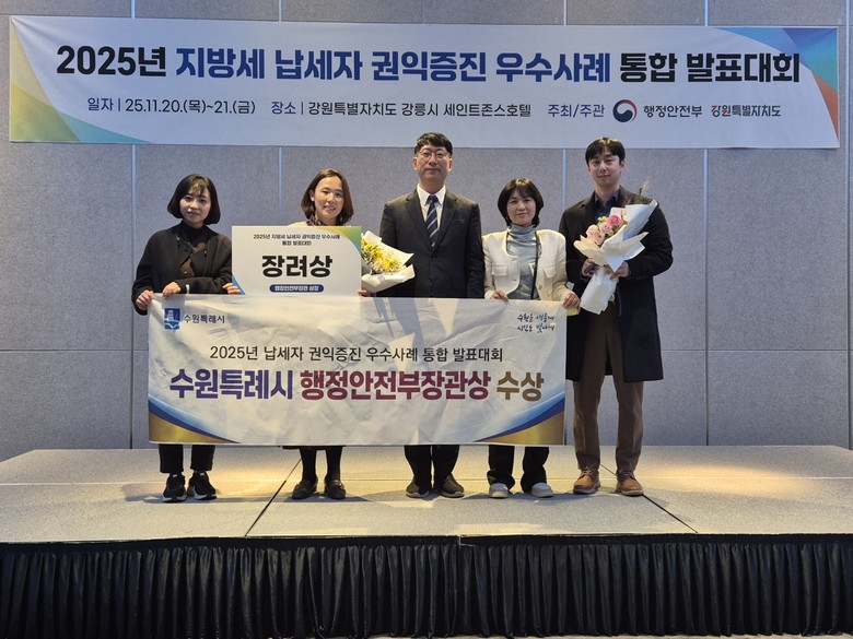 [수원시 세계타임즈=송민수 기자] 수원특례시(시장 이재준)가 행정안전부 주관으로 20~21일 강릉시 세인트존스호텔에서 열린 ‘2025년 납세자 권익 증진 우수사례 통합 발표대회’에서 장려상을 받았다.
