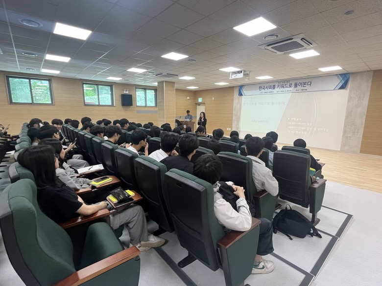 [파주시 세계타임즈=송민수 기자] 파주 심학고등학교(교장 김현제)는 5월 29일 사회학자 조형근 박사를 강사로 모시고‘한국 사회를 키워드로 풀어본다’라는 주제로 우리 사회의 다양한 문제의 원인과 해결 방안에 대해 함께 생각해 보는 기회를 가졌다.
