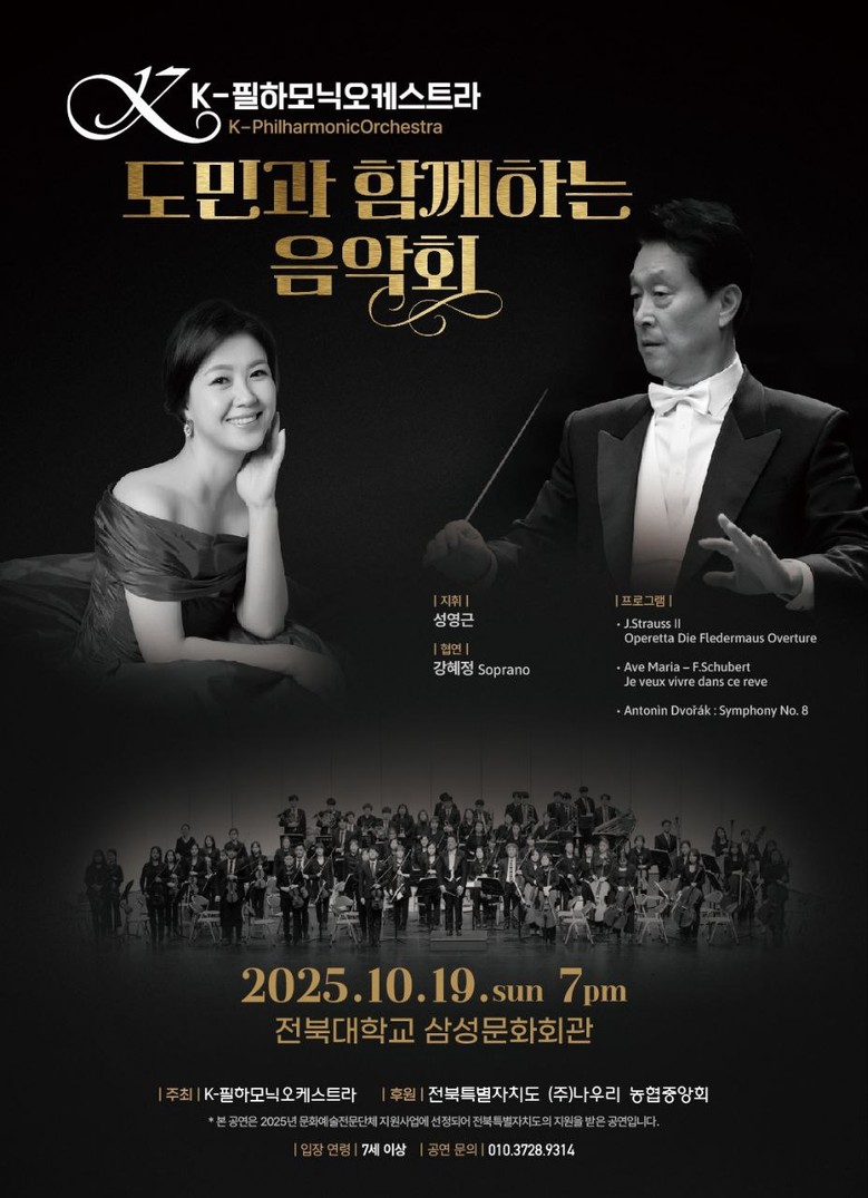 [전북=세계타임즈 이영임 기자] 전북을 대표하는 민간 오케스트라 K-필하모닉 오케스트라가 도민과 음악으로 교감하는 특별한 무대를 마련한다. 오는 19일 오후 7시, 전북대학교 삼성문화회관에서 열리는 '도민과 함께하는 음악회'는 가을의 풍경을 물들이는 클래식 선율과 지역민에게 깊은 감동을 선사할 예정이다.