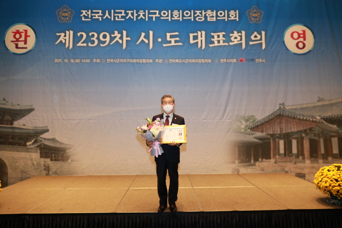 [무주=세계타임즈 최준필 기자] 무주군의회 박찬주 의장이 19일 그랜드힐스턴호텔에서 개최된 전국시군자치구의회의장협의회 제239차 시·도대표회의에서 의정봉사상을 수상했다.