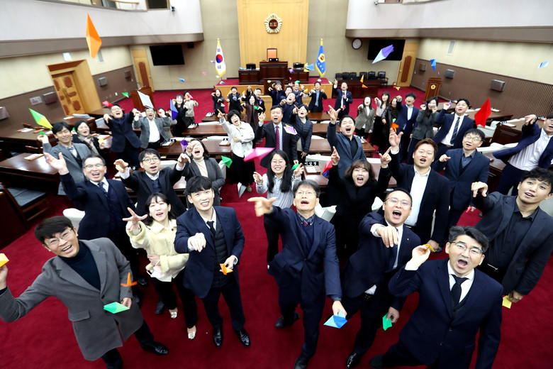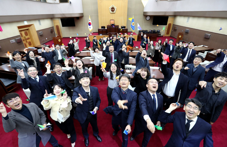 [충북 세계타임즈=이현진 기자] 2023년 첫 출근한 충북도의회 사무처 직원들이 본회의장에서 새해 희망을 담은 종이비행기를 날리고 있다./충북도의회 제공.