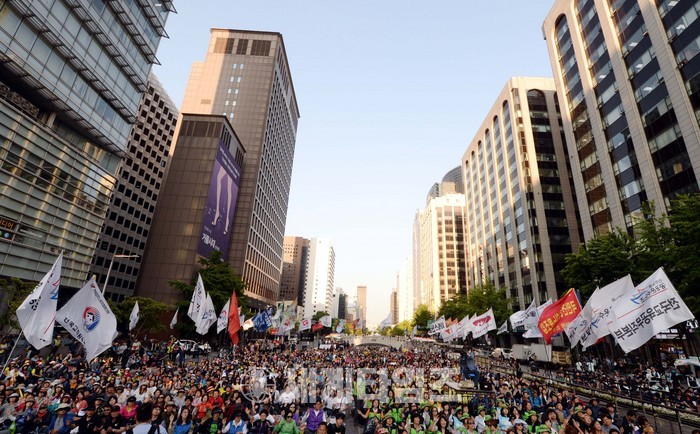 27일 오후 서울 종로구 청계광장에서 열린 ‘지금 당장’ 촛불행동 집회에서 참가자들이 '최저임금 만원’을 촉구하는 구호를 외치고 있다. 2017.05.27.