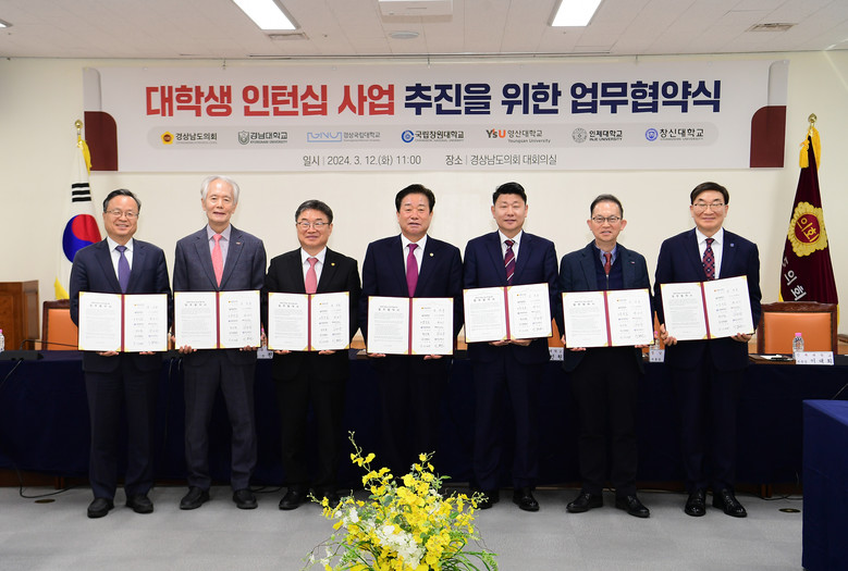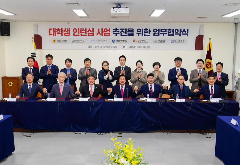 경남도의회는 12일 도의회 대회의실에서 경남도내 소재 6개 대학*과 대학생 인턴십(2024년 여름방학 시행)의 성공적인 추진을 위한 업무협약을 체결했다.