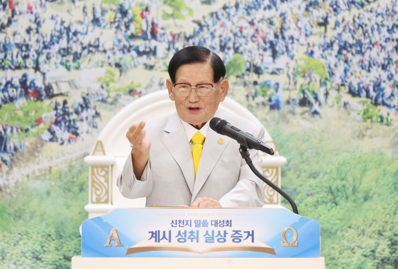 23일 경기도 청평 신천지 평화연수원에서 목회자를 대상으로 열린 ‘신천지 말씀대성회 계시성취 실상증거’에서 이만희 총회장이 강의를 하고 있다.