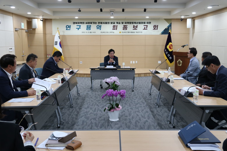 [경북 세계타임즈=한성국 기자] 경북도의회 「경상북도 전통식품 발굴.계승 연구회」(대표 이춘우 의원)는 23일(월) 도의회 다목적실에서 “경북지역의 사라져가는 전통식품의 발굴 계승 및 지역향토특산품화를 위한 연구 용역” 최종보고회를 개최했다.