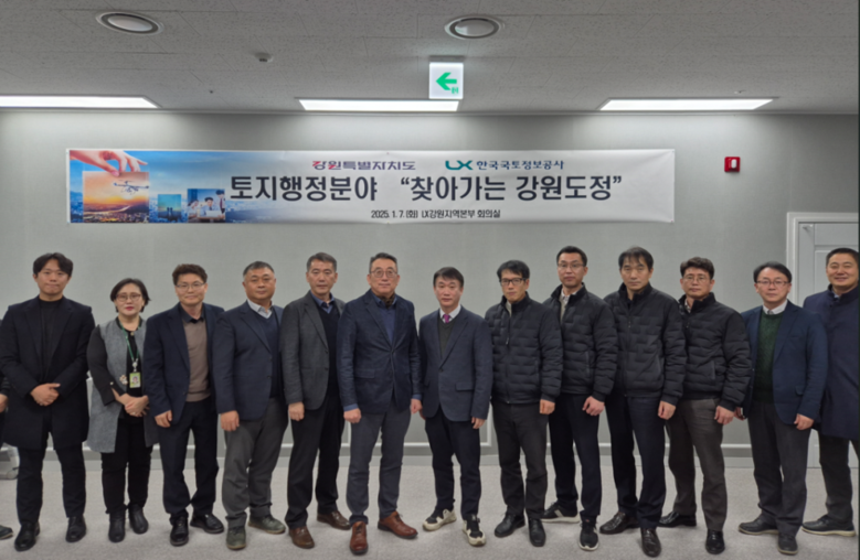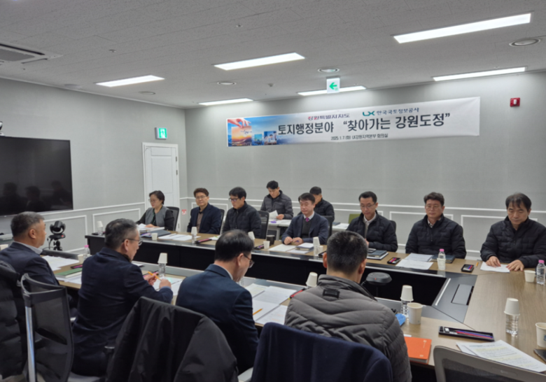[강원도 세계타임즈=김민석 기자] 강원특별자치도(도지사 김진태, 이하 ‘도’)와 한국국토정보공사(이하 ‘LX’)는 1월 7일(화) 오전 10시, 한국국토정보공사 강원지역본부에서 손형욱 강원특별자치도 토지과장, 이강성 LX 강원지역본부장 등 관계자 20여 명이 참석한 가운데 토지행정 분야의 ‘찾아가는 강원도정’ 간담회를 개최했다.