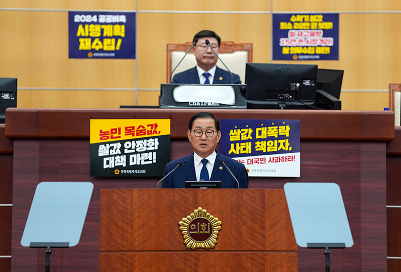 [전북특별자치도의회=세계타임즈 이상호 기자] 전북특별자치도의회 임승식 의원(정읍1ㆍ더불어민주당)이 제413회 임시회 제1차 본회의에서 ‘쌀값 대폭락 사태에 대한 정부의 대국민 사과 및 국가 차원 대책 마련 촉구 건의안’을 대표 발의했다.