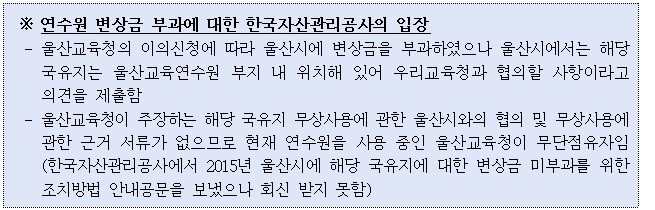 연수원 매각 후 국유지 점유에 대해 한국자산관리공사에서 유선상 문의가 왔을 때, 울산교육연수원 소유주인 울산시와 협의할 사항이라 답변하였고, 당시 한국자산관리공사 담당자로부터 무상사용 가능하다는 유선상 답변을 받았습니다.