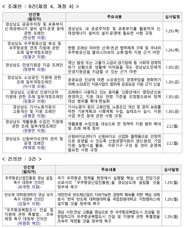 조례안은 공공주차장과 유휴부지를 활용한 신·재생에너지 설비 설치·운영 근거 마련, 우주항공산업 육성을 위한 산·학·연·관 협력체계 강화, 재난·경제위기 상황에서의 민생지원금 지급 근거 신설, 공공요금 인상에 따른 소상공인 경영부담 완화, 중장년 정책 대상 확대, 가사노동자의 고용안정과 권익 보호, 재활용품 수집인 지원 확대, 산림바이오센터의 안정적 운영 기반 구축 등 민생 안정과 산업 활성화, 환경·산림 분야 전반을 포함된다.