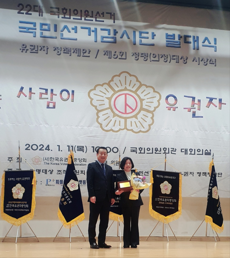 정명 의정대상은 한국유권자중앙회가 정의롭고 공정하며 밝은 세상을 위해 가장 공로가 큰 개인 또는 단체에 수여하는 상으로 국회의원, 광역·기초의원 등이 선정 대상이다.
