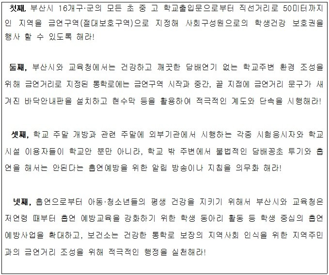 따라서 이 의원은 부산지역 학교 주변의 금연구역 지정을 통해 담배연기 없는 쾌적한 학교 환경 조성을 위해 다음과 같이 촉구했다.