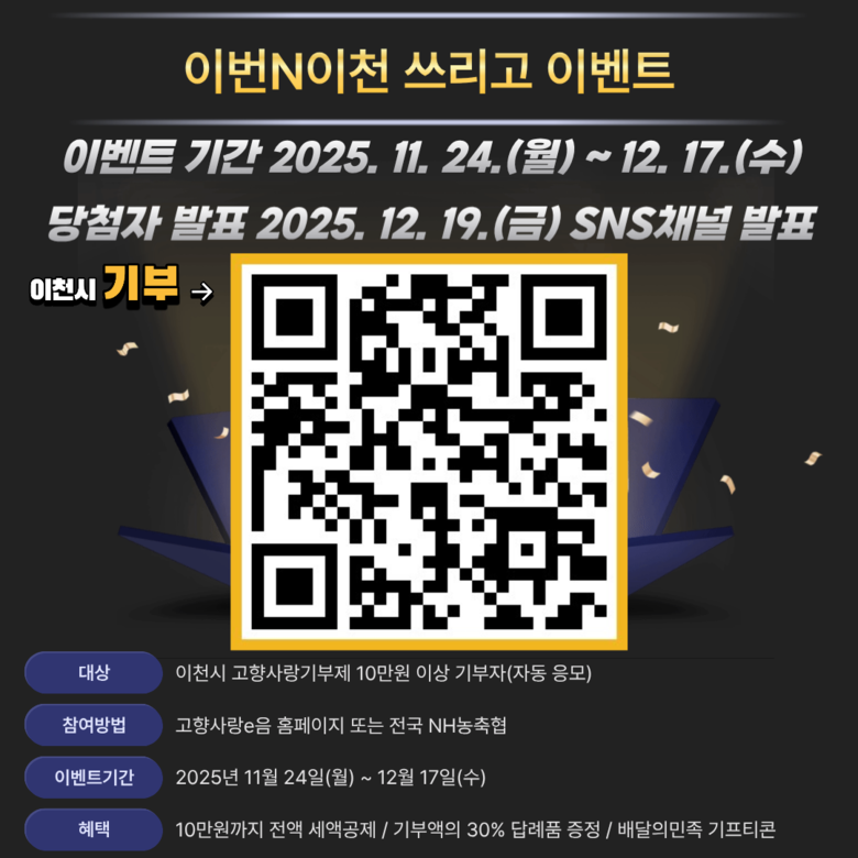 먼저, 11월 24일부터 12월 17일까지 진행하는‘이번N이천 고향사랑기부제 쓰리고 이벤트’는 이천시 공식 사회관계망(SNS)인 인스타그램과 블로그를 통해 안내되고 있다. 행사 기간 동안 이천시에 고향사랑 기부를 완료한 기부자라면 별도의 신청 없이 자동으로 응모되며, 추첨을 통해 총 100명에게 1만 원 모바일 기프티콘이 지급된다. 이는 이천시가 올해 추진한 시민참여형 홍보 캠페인의 일환으로, 연말 감사의 마음을 전하고 기부 문화를 확산하기 위한 취지로 마련되었다.