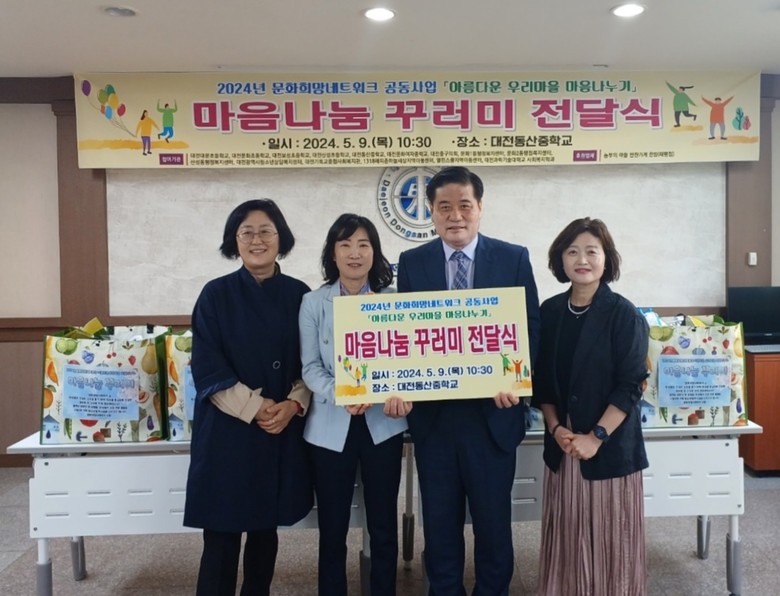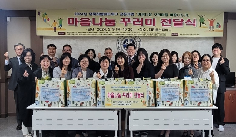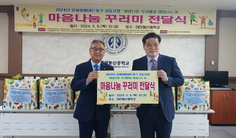[대전 세계타임즈=이채봉 기자] 대전동산중학교(교장 나충열)는 5월 9일(목), 회의실에서 문화희망네트워크 15개 기관이 참여한 가운데 ‘마음나눔 꾸러미 전달식’을 가졌다고 밝혔다.