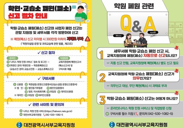 이번 안내 리플릿은 폐업으로 인한 사업자 말소 신청을 위해 세무서를 방문한 민원인에게 세무서뿐만 아니라 교육청에도 반드시 방문하여 폐원·폐소 신고를 해야 함을 알리기 위해 제작되었다. 현행법상 교육청에 신고하지 않을 경우 무단 폐원·폐소로 간주되어 학원법에 따라 300만 원 이하의 과태료가 부과될 수 있다.