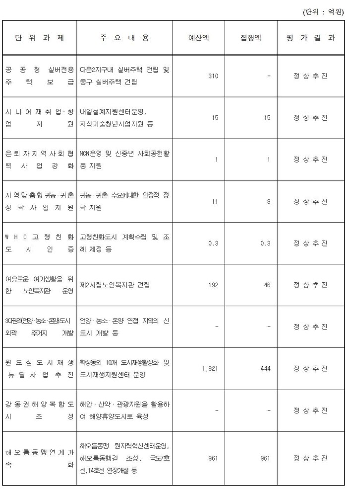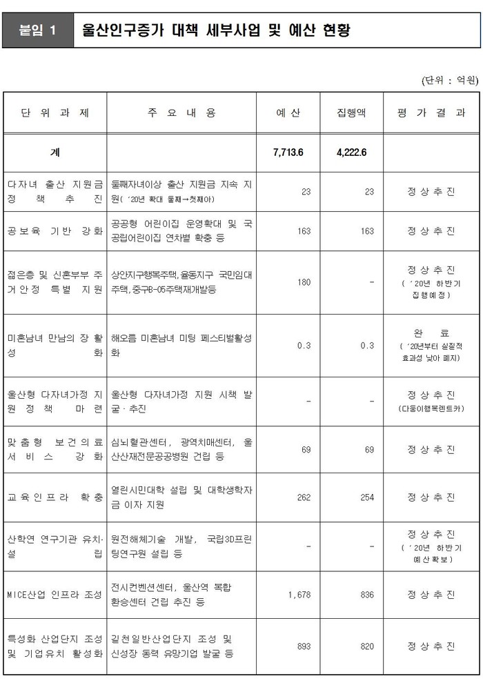 둘째, 「울산인구증가대책」 추진에 대한 단위 사업별 예산과 단위사업에 대한 평가결과에 대하여 답변 드리겠습니다.