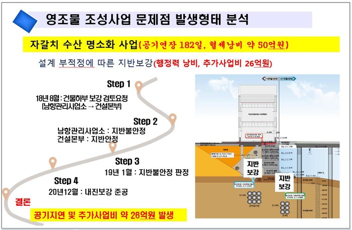 - 이 사업장의 설계단계에서부터 잘못된 지반설계로 시행된 지반보강공사비 26억원 추가 발생, 이 건물 이용자의 편의가 반영되지 않은 설계에 따라 창호변경 등 시설개선에 19억원 추가 투입과 이 사업장의 공기연장 182일 연장에 따른 4억원으로 눈에 보이는 혈세만 약 50억원이 더 낭비되는 것으로 파악했다.