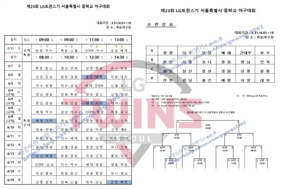 [세계타임즈 김인수 기자] LG트윈스와 서울시 야구협회가 공동주최하는 23회 LG트윈스기 서울시 춘계 중학교 야구대회가 오는 3월 31일(토) 부터 4월 25일(수)까지 목동야구장과 구의야구장에서 열린다.