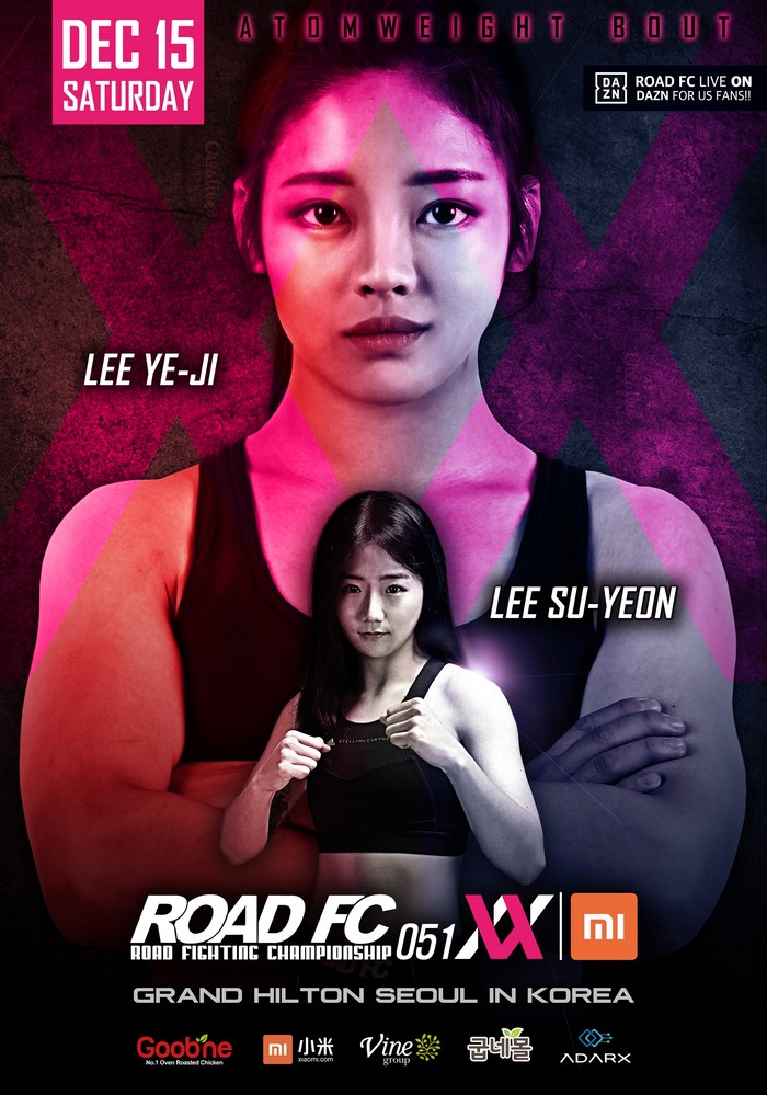 한편 ROAD FC는 12월 15일 그랜드 힐튼 서울에서 XIAOMI ROAD FC 051이 끝난 뒤 여성부리그 XIAOMI ROAD FC 051 XX를 연이어 개최한다. 메인 이벤트로 세계랭킹 1위의 ROAD FC 아톰급 챔피언 함서희와 ‘몬스터 울프’ 박정은의 타이틀전이 확정돼 아톰급 챔피언을 가린다.