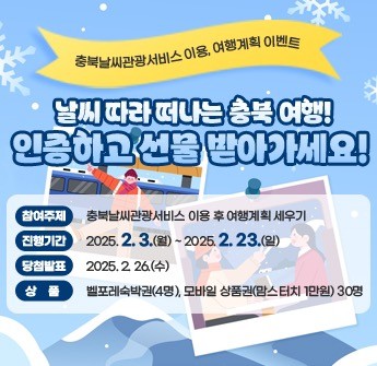 이번 이벤트는 3일부터 2월 23일까지 3주간 진행되며, 여행 날짜(당일치기, 1박2일 등)와 여행지역 선호도에 따른 관광지를 추천받고 올해 충북 여행계획을 본인의 SNS 계정에 공유함으로써 충북날씨관광서비스 이용 확대 및 충북 관광자원을 알리기 위해 기획됐다.