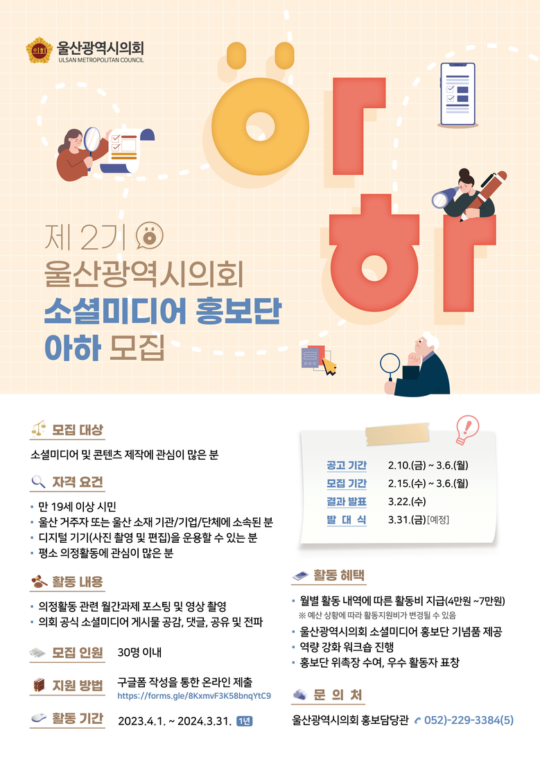 신청자격은 울산에 거주하는 만 19세 이상 시민으로 평소 의정 활동에 관심이 많고, 활성화된 소셜미디어 계정소지자로 정기적으로 포스팅이 가능하며, 디지털 기기를 운용할 수 있어야 한다.