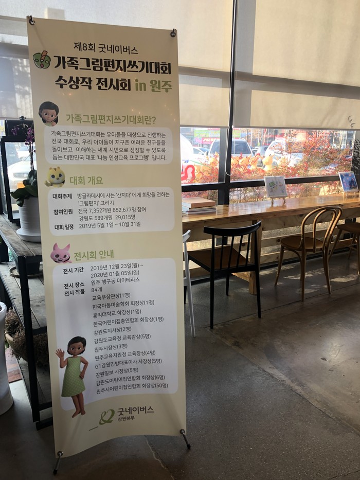 [강원도=세계타임즈 김민석 기자] 국제구호개발 NGO 굿네이버스 강원본부(본부장 박미경)는 내년 1월 5일(일) 까지 원주 행구동 마이테라스에서 제8회 굿네이버스 가족그림편지쓰기대회 수상작 전시회를 진행한다.