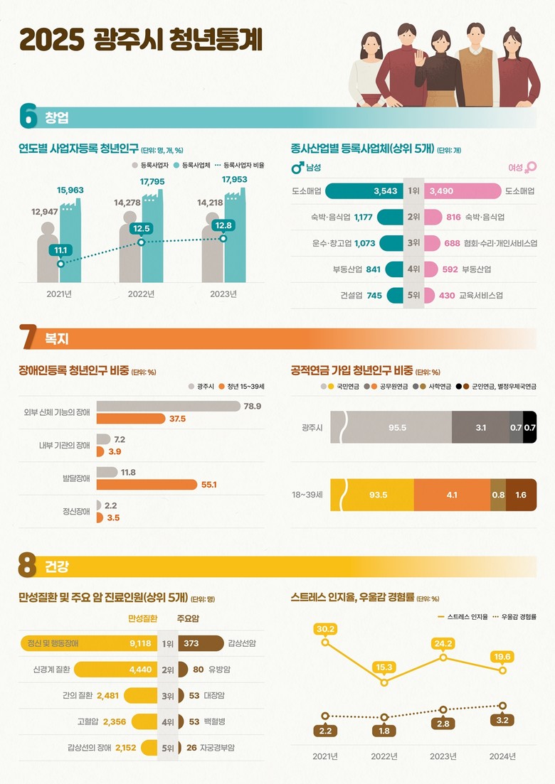 광주시 청년 통계는 2024년 11월 1일 기준 광주시에 거주하는 청년을 대상으로 행정자료와 각종 통계 데이터를 연계·분석한 행정 통계다. 인구, 가구, 인구 이동, 경제, 일자리, 창업, 복지·건강, 의식 등 9개 분야 79개 항목을 담았다.