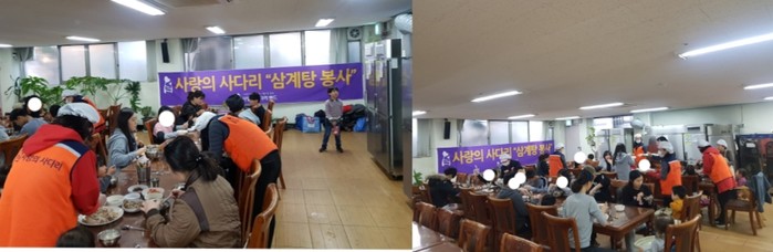 [대전=세계타임즈 이장성 기자] 추운날씨에도 다양한 봉사활동을 꾸준히 하고 있는 대전시 SNS 봉사단체 사랑의 사다리 밴드(리더 이정제)는 23일 오후5시, 동구 소제동에 위치한 자혜원(원장 양승연)에서 아이들 저녁식사 시간에 삼계탕 봉사로 우리 사회의 따뜻한 사랑을 전달하였다.