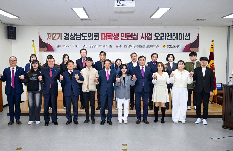 [경남 세계타임즈=최성룡 기자] 경상남도의회가 7일 제2기 대학생 인턴십 사업 오리엔테이션을 개최하고 의회·대학·인턴(학생) 간 3자 협약을 체결하며 사업의 본격적인 착수를 알렸다. 이번 인턴십 사업은 도내 지역대학과의 교류·협력을 통해 의원들의 정책활동을 지원하고, 대학생들에게 의회 체험 및 진로탐색 기회를 제공하는 것을 목적으로 한다.