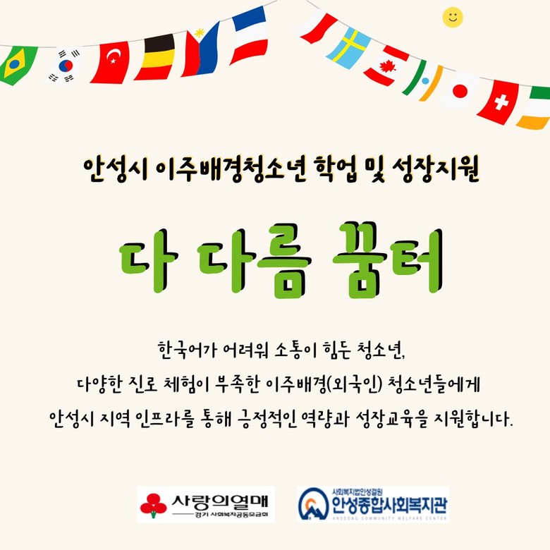 ○ 한국어, 진로체험, 사례관리로 지역사회 적응 지원 [안성시 세계타임즈=송민수 기자] 안성종합사회복지관은 경기사회복지공동모금회 지원으로 이주배경(외국인) 청소년 대상 학업·사회적응 지원사업 ‘다다름 꿈터’ 참여자를 1월 28일(수)까지 모집한다.