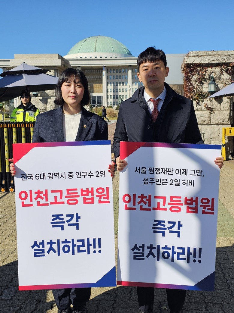 인천광역시의회 행정안전위원회 소속 이단비(국·부평3)·신성영(중구2) 의원은 인천고등법원 관련 법률안 통과를 촉구하는 여론이 확산하는 가운데 최근 국회의사당 앞에서 1인 시위를 벌였다고 14일 밝혔다.