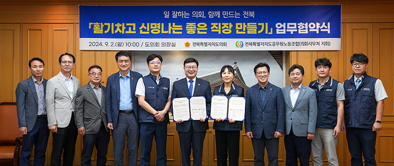 [전북특별자치도의회=세계타임즈 이상호 기자] 전북특별자치도의회와 전북특별자치도공무원노동조합(의회사무처 지회)은 2일 도의회 의장실에서 ‘활기차고 신명 나는 좋은 직장 만들기’를 위한 업무협약을 체결했다.