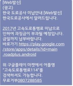 한국도로공사 사칭 문자스미싱은 고속도로 미납으로 과징금이 부과될 예정이어서 금일까지 납부하라고 안내하고 있으며 개인정보 등 탈취를 위하여 문자내 인터넷 URL 클릭 후 고속도로통행료 114 앱 설치를 유도하고 있다.