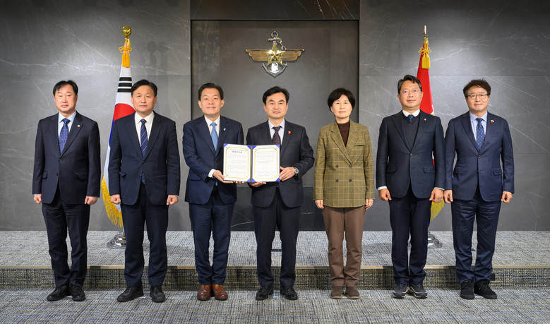 ▲ 이재준 수원시장(왼쪽 세 번째)과 수원 지역 국회의원 5명이 안규백 국방부장관(왼쪽 4번째)에게 ‘수원 군 공항 이전의 국가전략 사업화를 위한 공동 건의문’을 전달한 후 함께하고 있다. 왼쪽부터 김준혁 의원, 김영진 의원, 이재준 시장, 안규백 장관, 백혜련 의원, 김승원 의원, 염태영 의원. 국방부 제공.