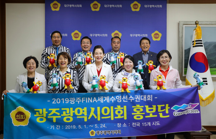 [대구=세계타임즈 한성국 기자] 대구광역시의회 배지숙 의장을 비롯한 이영애 문화복지위원장, 김성태 의원은 5월 23일 14시 30분 대구시의회 접견실에서 광주광역시의회 수영선수권대회 홍보단과 세계수영선수권대회 지원과 참여를 논의하는 간담회를 가졌다.