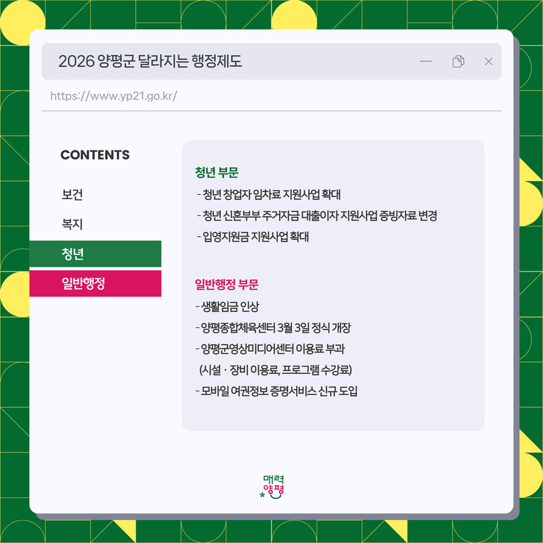 이번에 개선되는 제도는 의료 접근성 강화, 청년·신혼부부 지원 확대, 양평종합체육센터 개장 등 군민 삶의 질 향상에 중점을 두고 마련됐다.