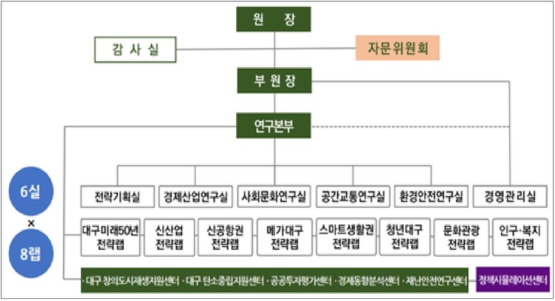 ‘23년 2월 공식 출범한 ‘대구정책연구원’은 현재 '6 연구실'과 특화 정책개발을 위한 '8 전략랩'을 운영 중으로 전략과제, 정책과제, 수탁과제, 보조사업 등 다양한 연구과제를 수행하고 있으며 대구시 주요 현안 해결과 정책개발을 위해 다양한 협력 연구를 진행하고 있다.