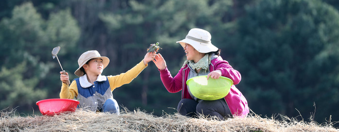 포근한 봄날씨를 보인 27일 지리산 자락인 경남 함양군 마천면 창원마을 논두렁에서 한 가족 냉이, 쑥, 달래 등 봄나물을 캐고 있다.