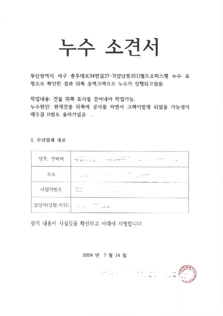 [세계타임즈 = 이진화 기자] 부산광역시 서구 암남동 소재 월드오피스텔 지하실에 '심각한 누수와 곰팡이′의 발생 때문에 전문업체의 확인한 결과 뒤쪽 옆 건물 신축 공사현장 방향 옹벽크랙으로 누수가 진행되고 있는 것으로 알려져 지하실 입주민이 반발하고 나섰다.