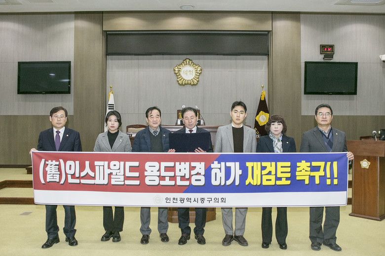이에 중구의회는 이번 처분에 대해, ‘용도변경이 이루어진 후에 단속하여 문제를 방지하겠다는 것은 사후약방문식 행정이며 소극적이고 안일한 행정이 아닐수 없다’라고 강력하게 규탄하면서, ‘불안에 떠는 지역주민들의 우려를 해소하기 위해서라도 (구)인스파월드 용도변경 승인 건에 대해 재검토해 줄 것을 강력하게 촉구한다’는 성명서를 발표했다.