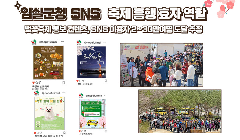심 민 군수는“임실군청 SNS를 활용한 이번 홍보 전략이 지역 대표 축제의 매력을 효과적으로 알리는 데 큰 역할을 했다”며“앞으로도 전국적인 확산력이 큰 SNS의 장점을 더욱 살려 뉴미디어를 중심으로 한 홍보를 강화하겠다”고 말했다.